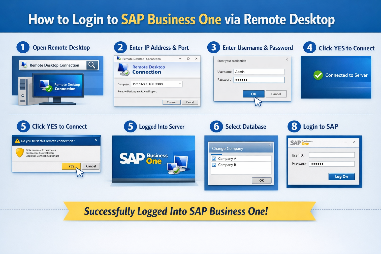 Accessing SAP Business One through Remote Desktop is simple when you follow the correct steps. This guide will help users log in smoothly and securely.