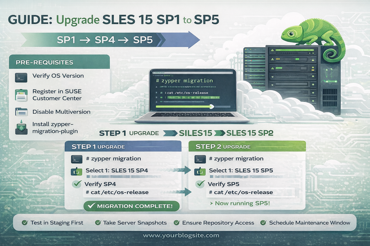 Migrating from SLES 15 SP1 to SP5 is a structured process that ensures system stability while keeping enterprise servers secure and updated. By following the staged migration approach — SP1 → SP4 → SP5 — you can safely upgrade production environments with minimal risk.