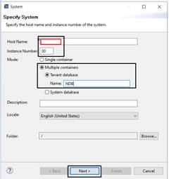 4.Enter the Hana server (SUSE) IP Address à Instance Number 00 à click in check box Multiple Container à Tenant DB Name àClick on Next