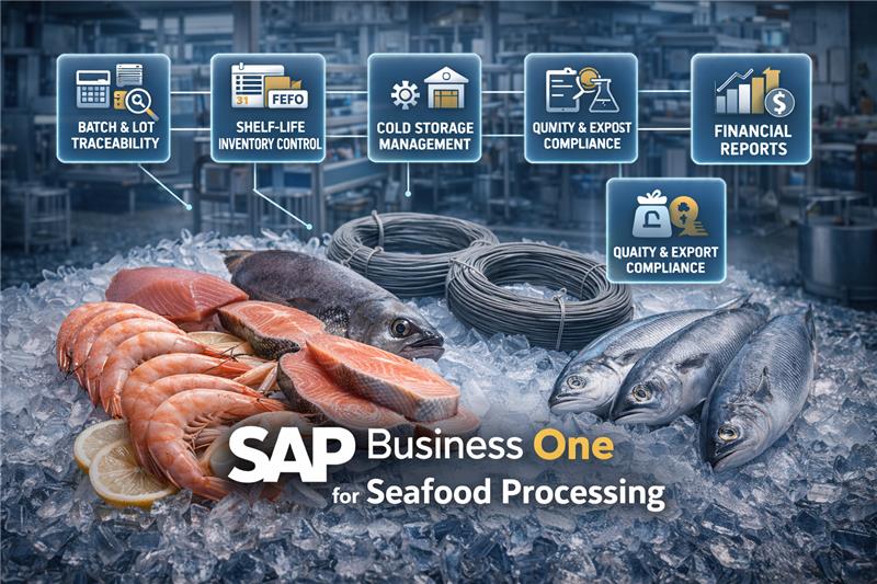 By implementing SAP Business One, seafood processors gain a centralized platform to manage procurement, processing, cold storage, quality, sales, finance, and compliance with complete visibility and control. This integrated approach improves operational efficiency, ensures regulatory compliance, reduces spoilage, and supports sustainable growth in a highly competitive seafood market.