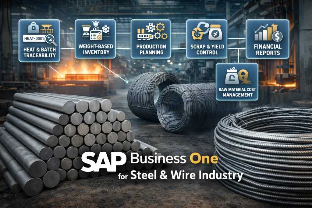 Many steel and wire manufacturers rely on disconnected systems for production, inventory, sales, and finance, resulting in limited visibility, inaccurate weight-based tracking, yield leakage, and delayed decision-making. SAP Business One provides a unified ERP platform that integrates production planning, weight-based inventory, batch/heat traceability, sales, finance, and quality control—delivering real-time visibility and operational control across the steel and wire manufacturing lifecycle.