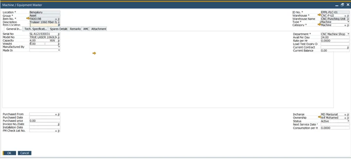 - Asset and equipment master set up with AMC, warranty, spares, and attachments